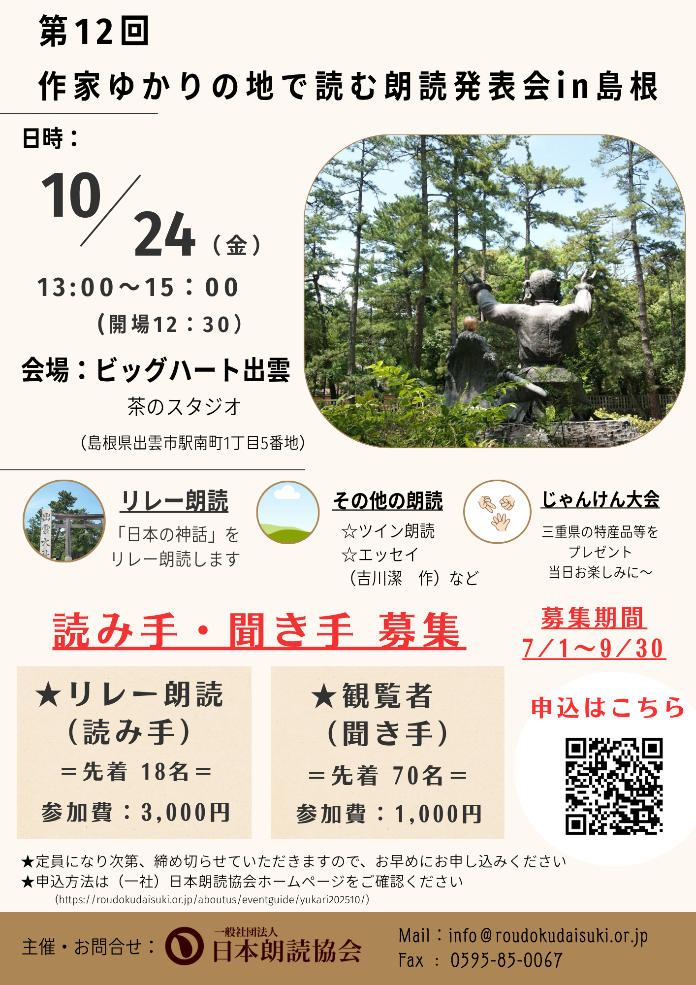 | 一般社団法人日本朗読協会 第12回作家ゆかりの地で読む朗読発表会 in 島根 |