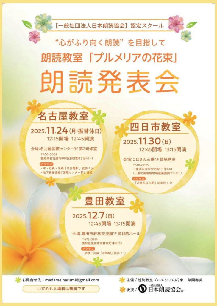 朗読教室「プルメリアの花束」朗読発表会のお知らせ ・・・・・・・・・・・・・・・・・・・・・・・・・・・・ 朗読教室「プルメリアの花束」朗読発表会