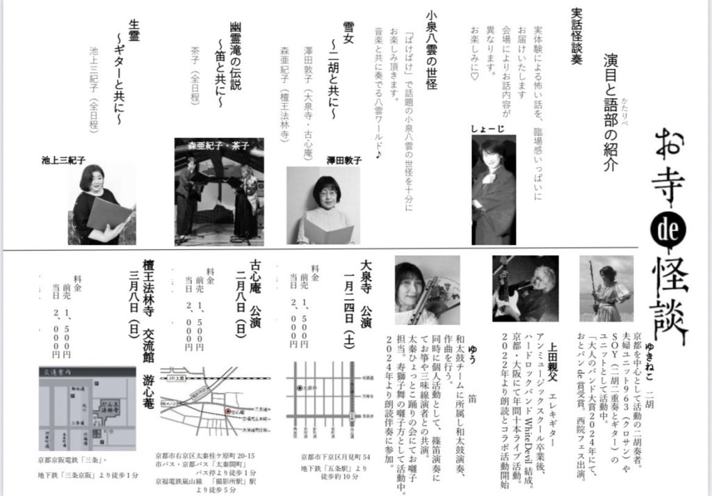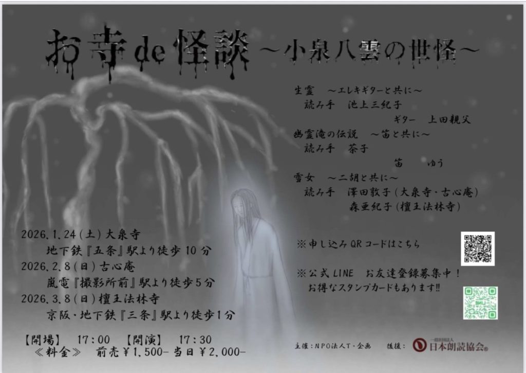 朝ドラ『ばけばけ』にて話題の、小泉八雲作品の中から、選りすぐった三作品をお届けいたします。 各日程により場所が異なりますので、お近くの場所をご利用ください。 また、小泉八雲の作品には、今回は二胡・エレキギター・笛の音色で花を添えて頂きます! 詳細は、チラシをご覧頂き、QRコードよりお申し込みください!![]()